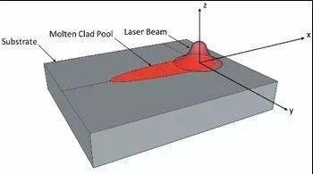 激光熔覆所需要的激光器功率要達(dá)到數(shù)千瓦級,這意味著上百萬束手持紅色激光束同時聚焦在不到一枚硬幣大小的區(qū)域。此時聚焦在金屬表面產(chǎn)生的熱量足以把基體熔化,對于鋼來講,表面溫度能夠達(dá)到2500~3000℃。針對不同的材料,在進(jìn)行表面熔覆時需要的熱量不同;但是對于同種材料來講,無論是采用激光熱源還是電弧熱源,都需要將母材加熱到熔化溫度,但是由于激光束是高度集中的熱源,因此其所需要的總能量要低于弧焊熱源。激光熱源只作用在需要的區(qū)域,而弧焊熱源中有很大一部分熱量要消耗在非加熱區(qū)域,所以在熔化金屬方面激光熱源更有效率 。簡單的講,電弧熔覆就像是探照燈,而激光熔覆就相當(dāng)于在必要的時候閃光提醒的激光束。與焊接相類似,激光熔覆時熔化的區(qū)域也叫作在熔池。